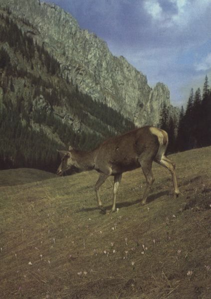 Łania (Cervus elaphus) na Hali Pisanej w Dolinie Kościeliskiej na wiosnę. W tle Raptawicka Turnia.