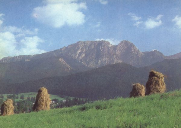 Widok na Giewont ze zboczy Gubałówki. Na pierwszym planie stogi siana.