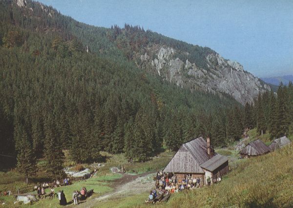 Turyści przy herbaciarni na Polanie Strążyskiej.