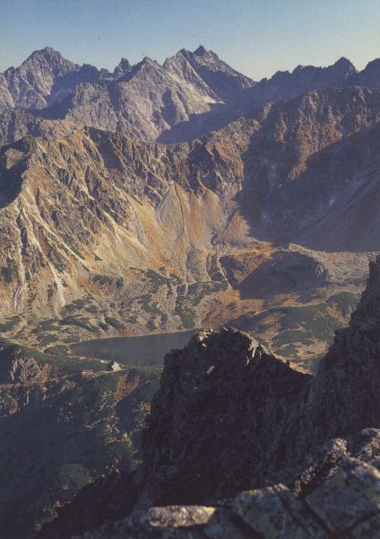 Widok z Granatów na Przedni Staw Polski, nad nim Opalony Wierch. W tle Rysy i Wysoka.