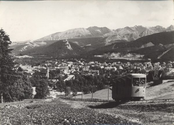 Wagon kolei linowo-terenowej na Gubałówkę. W dole widok ogólny na Zakopane.
