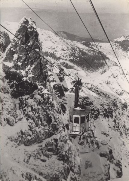 Wagonik kolei linowej w drodze na Kasprowy Wierch w scenerii zimowej.