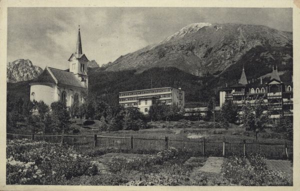 Kościół i dwa sanatoria w Nowym Smokowcu. Na pierwszym planie ogród. W tle Sławkowski Szczyt.