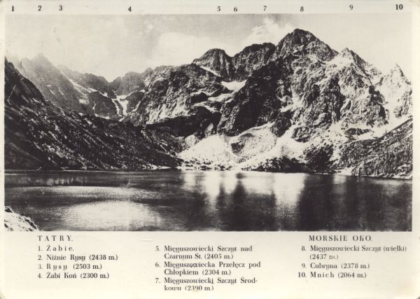 Otoczenie Morskiego Oka: Żabi Szczyt, Niżnie Rysy, Rysy, Żabi Koń, Mięguszowiecki Szczyt Czarny, Mięguszowiecka Przełęcz pod Chłopkiem, Mięguszowiecki Szczyt Pośredni, Wielki Mięguszowiecki Szczyt, Cubryna, Mnich. Nad zdjęciem drukowane cyfry oznaczające kolejne szczyty, pod zdjęciem tytuł: TATRY. MORSKIE OKO i opis szczytów wg kolejnych numerów.