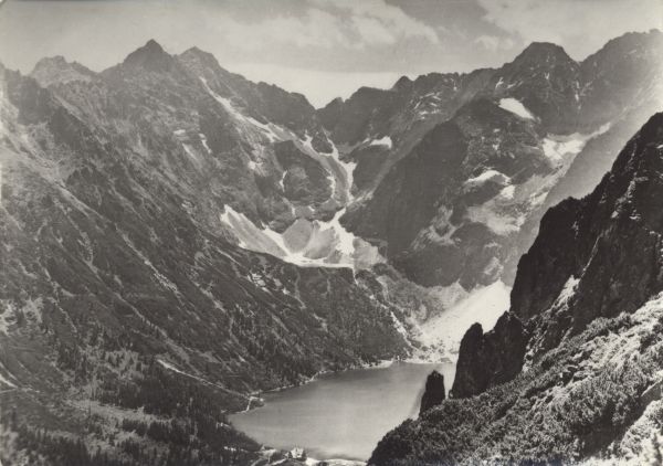 Pocztówka użyta w obiegu pocztowym, znaczek oderwany, korespondencja. Logo wydawcy. Dodatkowo nadruk z rysunkiem: "MORSKIE OKO 1410 m n.p.m. SCHRONISKO PTTK W TATRACH".
