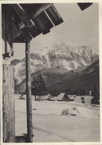 Szałasy na Polanie Chochołowskiej w zimie. W tle Kominiarski Wierch.