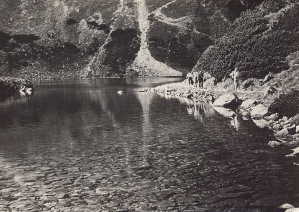 Czarny Staw G±sienicowy. Z prawej nad brzegiem tury¶ci wędruj± szlakiem turystycznym.