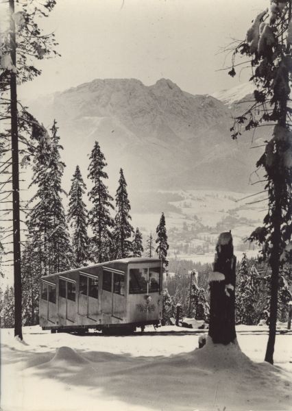Wagon kolei linowo-terenowej na Gubałówkę w zimie. W tle Giewont.