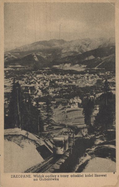 Wagon kolei linowo-terenowej na Gubałówkę. W dole widok ogólny na Zakopane. W tle panorama Tatr Wysokich. Pod zdjęciem drukowany opis: ZAKOPANE. Widok ogólny z trasy górskiej kolei linowej na Gubałówkę.