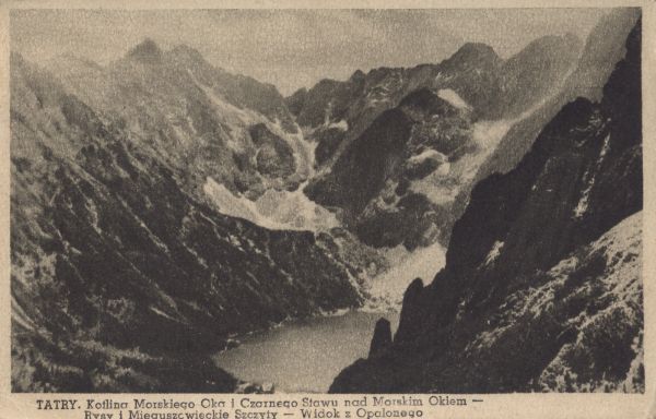 Widok na otoczenie Morskiego Oka z Opalonego Wierchu. Z lewej Rysy, z prawej Mięguszowieckie Szczyty. Pod zdjęciem drukowany tytuł: TATRY. Kotlina Morskiego Oka i Czarnego Stawu nad Morskim Okiem - Rysy i Mięguszowieckie Szczyty - Widok z Opalonego. Pod zdjęciem drukowany tytuł.