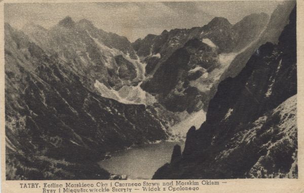 Widok na otoczenie Morskiego Oka z Opalonego Wierchu. Z lewej Rysy, z prawej Mięguszowieckie Szczyty. Pod zdjęciem drukowany tytuł: TATRY. Kotlina Morskiego Oka i Czarnego Stawu nad Morskim Okiem - Rysy i Mięguszowieckie Szczyty - Widok z Opalonego. Pod zdjęciem drukowany tytuł.
