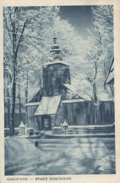 Stary Kościół w Zakopanem zimą. Pod zdjęciem drukowany tytuł.
