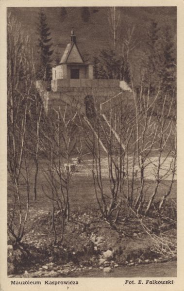 Mauzoleum Jana Kasprowicza na Harendzie w Zakopanem. Pod zdjęciem drukowany tytuł i nazwisko fotografa.