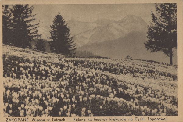 Polana kwitnących krokusów (Crocus scepusiensis) na Toporowej Cyrhli. Pod zdjęciem drukowany tytuł.