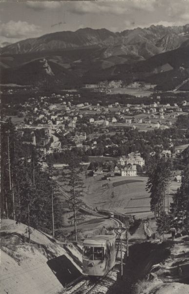 Wagony kolei linowo-terenowej na Gubałówkę. W dole widok ogólny na Zakopane.