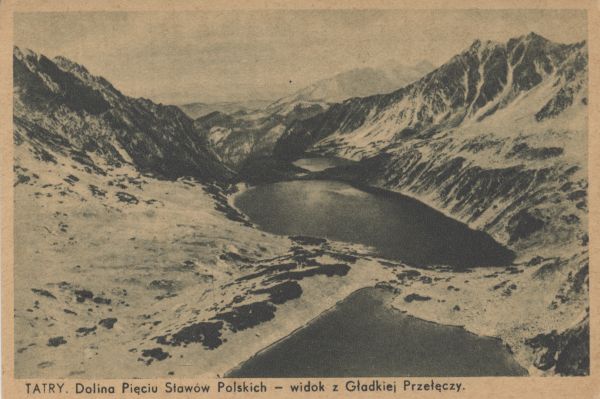 Widok z Gładkiej Przełęczy do Doliny Pięciu Stawów Polskich. W dole Czarny i Wielki Staw Polski. Z prawej w tle Opalony Wierch. Pod zdjęciem drukowany tytuł.