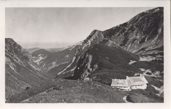 Schronisko w Dolinie Pięciu Stawów Polskich. Nad nim widoczny szlak na Świstówkę Roztocką. W dole Dolina Roztoki.
