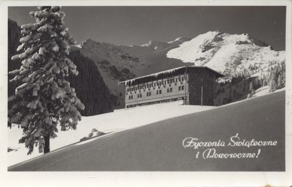 Hotel Górski na Polanie Kalatówki w zimowej scenerii. W głębi Kalacki Upłaz i Kalacka Turnia. Na zdjęciu w prawym dolnym rogu napis: Życzenia Świąteczne i Noworoczne!