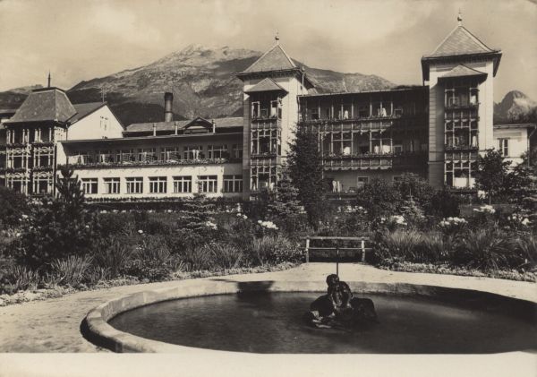 Budynek i otoczenie sanatorium Instytutu Chorób Płuc w Nowym Smokowcu. Na pierwszym planie fontanna, w głębi ogród. W tle Sławkowski Szczyt.