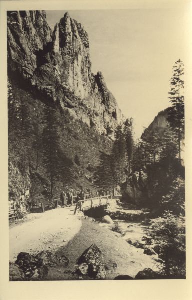 Raptawicka Turnia w Dolinie Kościeliskiej. W dole płynie Kościeliski Potok. Na mostku idą turyści.