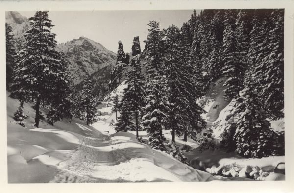 Kominy w Dolinie Strążyskiej w zimowej scenerii. W tle Mały Giewont.