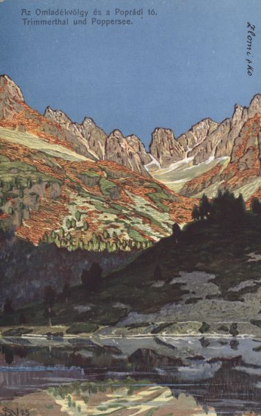 Reprodukcja obrazu Siegfrieda Neumanna przedstawiającego Dolinę Złomisk nad Popradzkim Stawem. U góry drukowany tytuł, również w języku niemieckim.