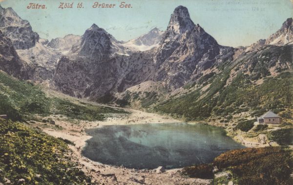 Otoczenie Zielonego Stawu Kieżmarskiego, nad brzegiem z prawej widoczne schronisko. W tle Czarny Szczyt, Kołowy Szczyt i Jastrzębia Turnia. U góry drukowany tytuł, również w języku niemieckim.
