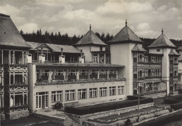 Budynek i otoczenie sanatorium Branisko w Nowym Smokowcu. Na pierwszym planie ogród. Na balkonach oraz przed sanatorium na ławeczkach siedzą turyści.