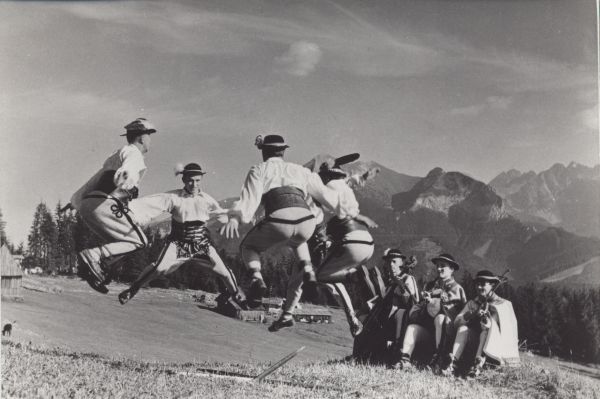 Zespół góralski podczas tańca góralskiego, w tle Murań.