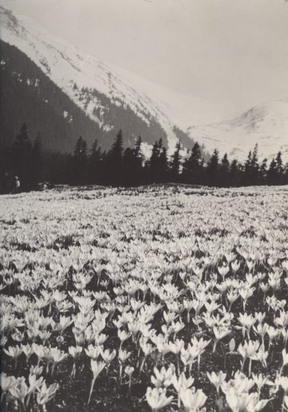 TATRY ZACHODNIE. Krokusy na Kalatówkach - w głębi stok Kasprowego Wierchu.