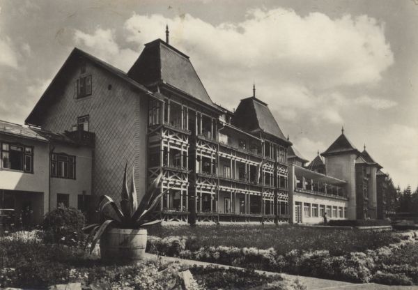 Budynek i otoczenie sanatorium Svią» w Nowym Smokowcu. Na pierwszym planie ogród.