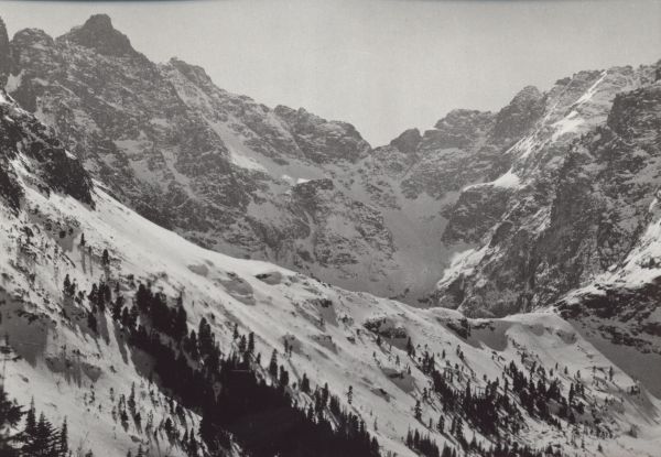 Otoczenie Morskiego Oka zimą. W tle od lewej: Niżnie Rysy, Rysy, Żabi Koń i Wołowy Grzbiet.