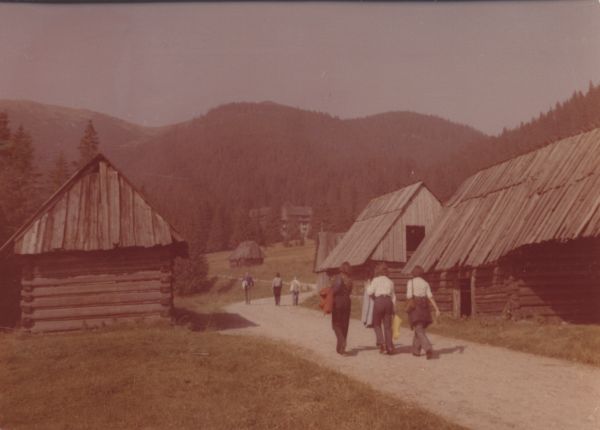 Szałasy pasterskie na Polanie Chochołowskiej. W tle widoczne schronisko. Na pierwszym planie turyści na szlaku.