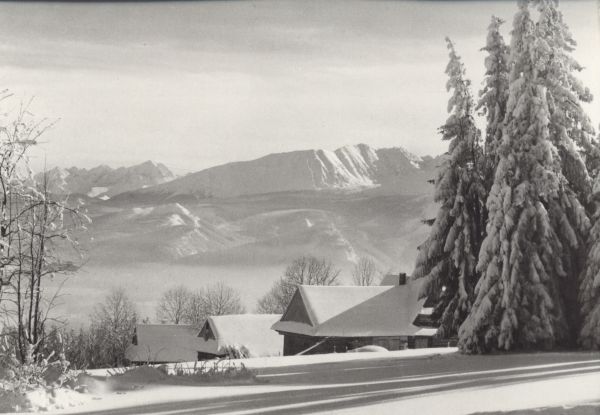 Zabudowania na Gubałówce w zimie. W tle panorama Tatr.
