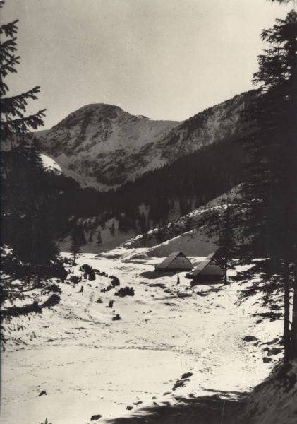 Szałasy w Dolinie Jaworzynki zimą. W tle Kopa Magury.