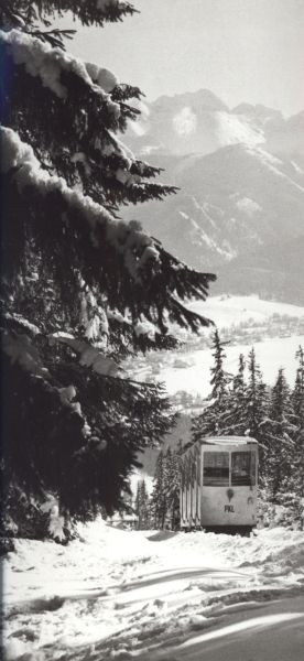 Wagonik kolei linowo-terenowej na Gubałówkę w zimie. W tle widok Świnicy.