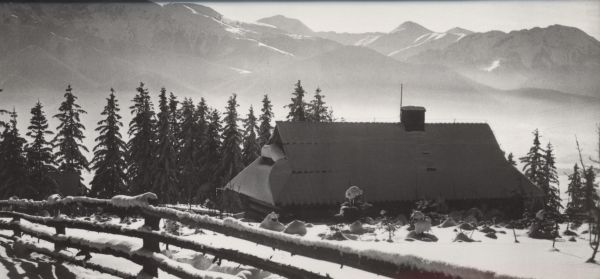 TATRY. Chata góralska na stokach Gubałówki. Na dalszym planie Tatry Zachodnie.