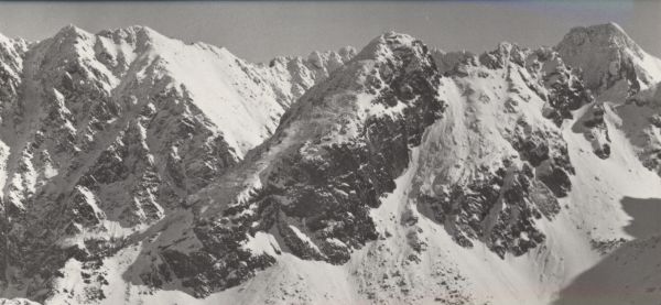 Widok na Granaty i Kościelec z Kasprowego Wierchu zimą.