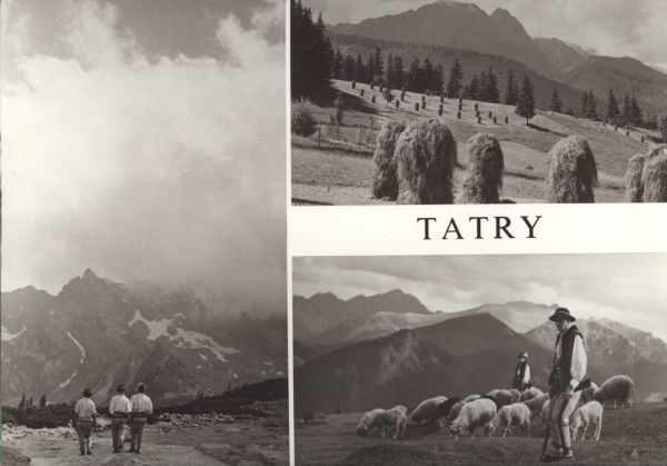 Górale z owcami na Rusinowej Polanie. Pomiędzy zdjęciami napis: TATRY.