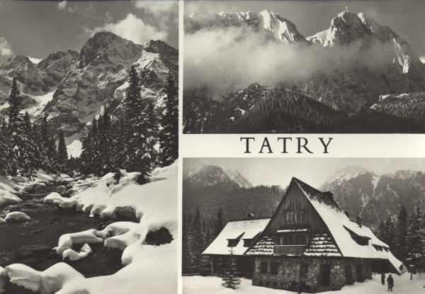 Schronisko na Hali Ornak w Dolinie Kościeliskiej. Pomiędzy zdjęciami napis: TATRY.