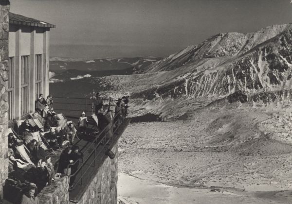 Tury¶ci na tarasie restauracji na Kasprowym Wierchu zim±. W dole Dolina G±sienicowa.