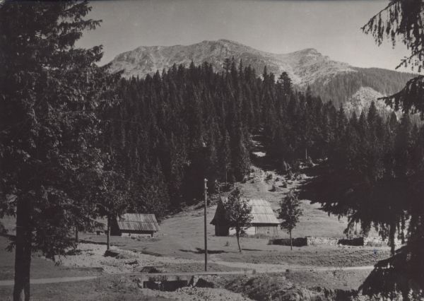 Szałasy na Polanie Huciska w Dolinie Chochołowskiej. W tle Kominiarski Wierch.
