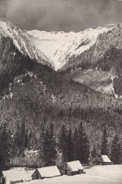 Widok z Hali Smytniej na Dolinę Smytnią zimą. W dole, na polanie, szałasy.