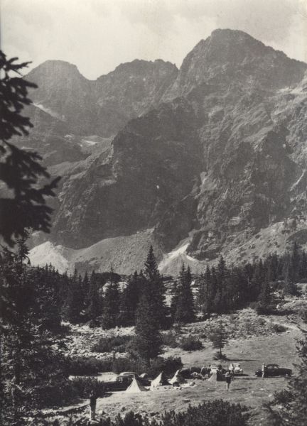 Mięguszowiecki Szczyt Czarny, Mięguszowiecka Przełęcz pod Chłopkiem, Mięguszowiecki Szczyt Pośredni i Mięguszowiecki Szczyt Wielki nad Morskim Okiem w Dolinie Rybiego Potoku. W przodzie obozowisko turystyczne.