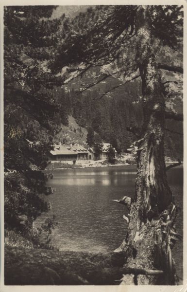Widok pomiędzy drzewami na schronisko nad Popradzkim Stawem (im. kpt. Morávku) i Popradzki Staw.