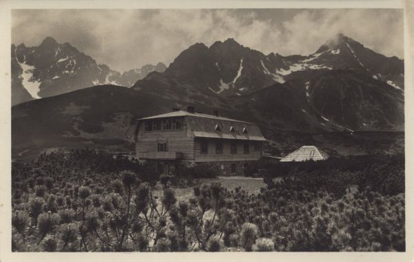Widok na schronisko Kieżmarskie Klubu Słowackich Turystów i Narciarzy w Dolinie Białych Stawów. Za schroniskiem Wielki Biały Staw. Na pierwszym planie kosodrzewina (Pinus mugo Turra). W tle od lewej: Durny Szczyt, Kozia Turnia i Jagnięcy Szczyt.
