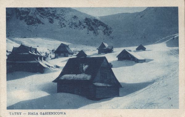 Hala G±sienicowa w ¶niegu. Liczne szałasy. Pod zdjęciem wydrukowany napis: TATRY-HALA GˇSIENICOWA.