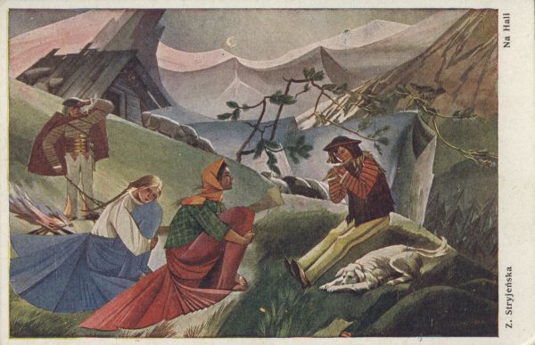 Reprodukcja obrazu Z. Stryjeńskiej "Na hali", przedstawiającego pastuszka grającego na fujarce, dwie słuchające góralki i górala. Obok pastuszka pies. W tle szałas i górskie szczyty. Na marginesie drukowany tytuł.