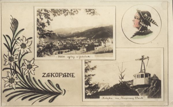 Pocztówka 3. elementowa: Widok ogólny na Zakopane z Gubałówki, na pierwszym planie wagonik kolei linowo - torowej. Wagonik kolei linowej na Kasprowy Wierch. Portret góala.