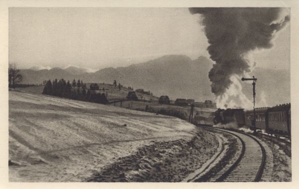 Pociąg pasażerski w drodze do Zakopanego. W tle Giewont.